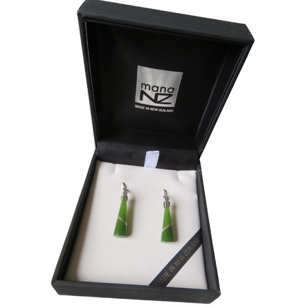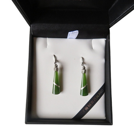 Wedge shaped greenstone earrings with silver thread set in sterling silver. The wedge is 23mm long and 7mm wide with a sterling silver band inlaid in the greenstone. Genuine New Zealand Pounamu (Greenstone), sourced and hand carved in Aotearoa (New Zealand). Pounamu is of great cultural significance for Maori and is believed to enhance mana (prestige) of its possessor. When received as a gift Pounamu is said to gain value as a special treasure.