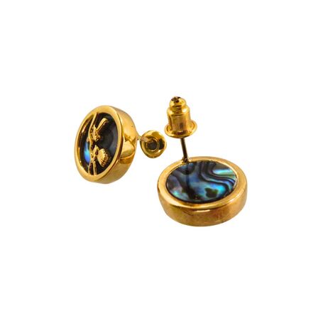 Beautiful Fern Round Stud earrings with Paua and 18 K gold PVD plated stainless steel. Gold-plating in the PVD process that ensures greater durability and prevention of tarnishing than other technologies, which means you can wear your jewellery in the shower, in the sea and it does not tarnish. The studs measure approximated 10mm in diameter and come in a lovely Wildside Gifts jewellery box.