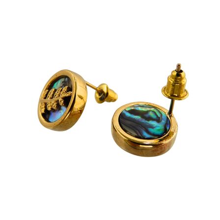 Beautiful Fern Round Stud earrings with Paua and 18 K gold PVD plated stainless steel. Gold-plating in the PVD process that ensures greater durability and prevention of tarnishing than other technologies, which means you can wear your jewellery in the shower, in the sea and it does not tarnish. The studs measure approximated 10mm in diameter and come in a lovely Wildside Gifts jewellery box.