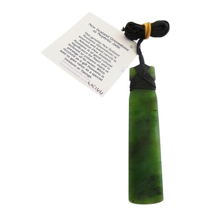A beautiful long New Zealand Greenstone Toki about 102mm long by 26mm wide bound with an adjustable waxed chord.
