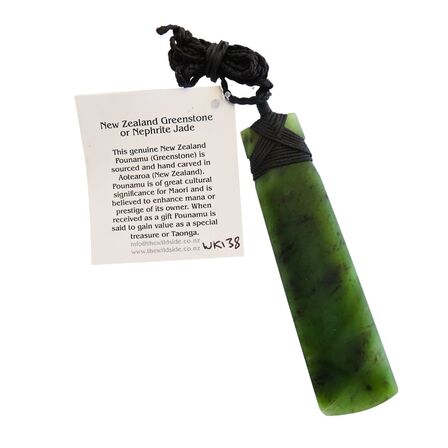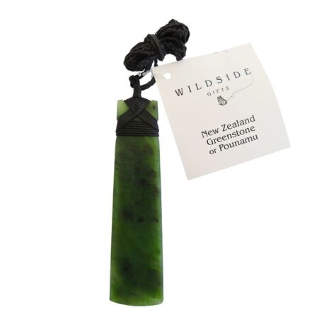 A beautiful transleucent New Zealand Greenstone Toki that measures about 97mm by 23mm and is beautifully bound with an adjustable waxed chord.