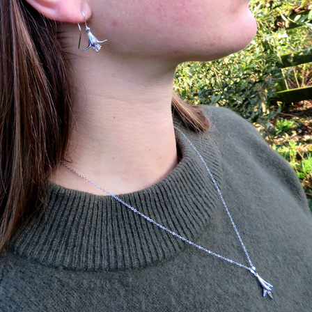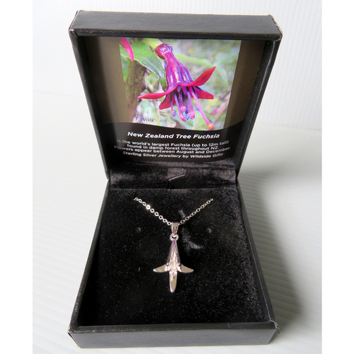 A beautiful, sterling silver Fuchsia pendant on a sterling silver chain (480mm long). The sterling silver flower is 15mm wide by 22mm long.