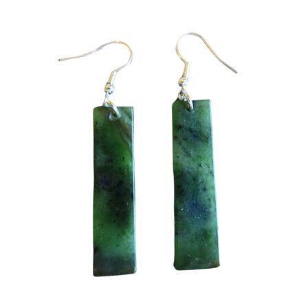 Exquisite Pounamu rectangular drop earrings measuring approximately 36-38mm long by 11mm wide. Each pair of earrings is unique with variations in the size and colour of the stone.