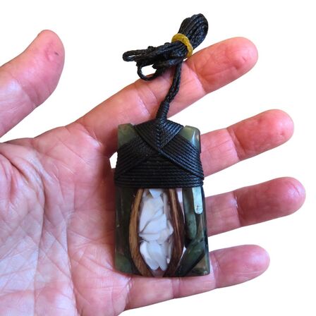 Unique, Art Toki made in New Zealand from New Zealand Greenstone, Paua, Pipi shell and recycled Rimu set in acrylic resin. The Toki measures approximately 60mm long by 37mm at the widest point. The photos show how each Toki is a unique combination of materials.